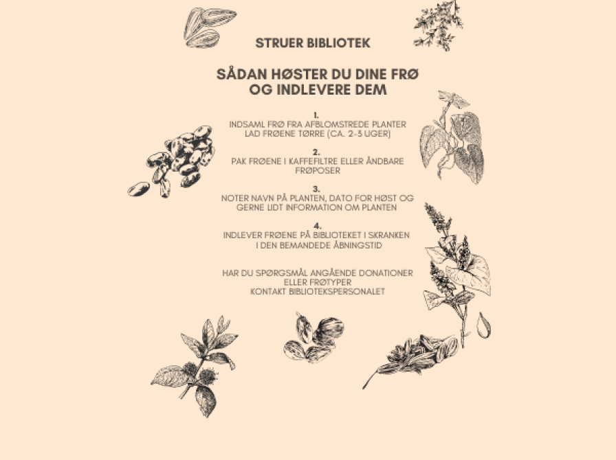 På biblioteket kan du finde vores frøbibliotek, hvor du kan bytte frø. Visionen med frøbiblioteket er at opbygge et fællesskab, hvor borgere kan donere og forsyne hinanden med forskellige frøtyper. Frøene må ikke være behandlet med GMO eller pesticider.